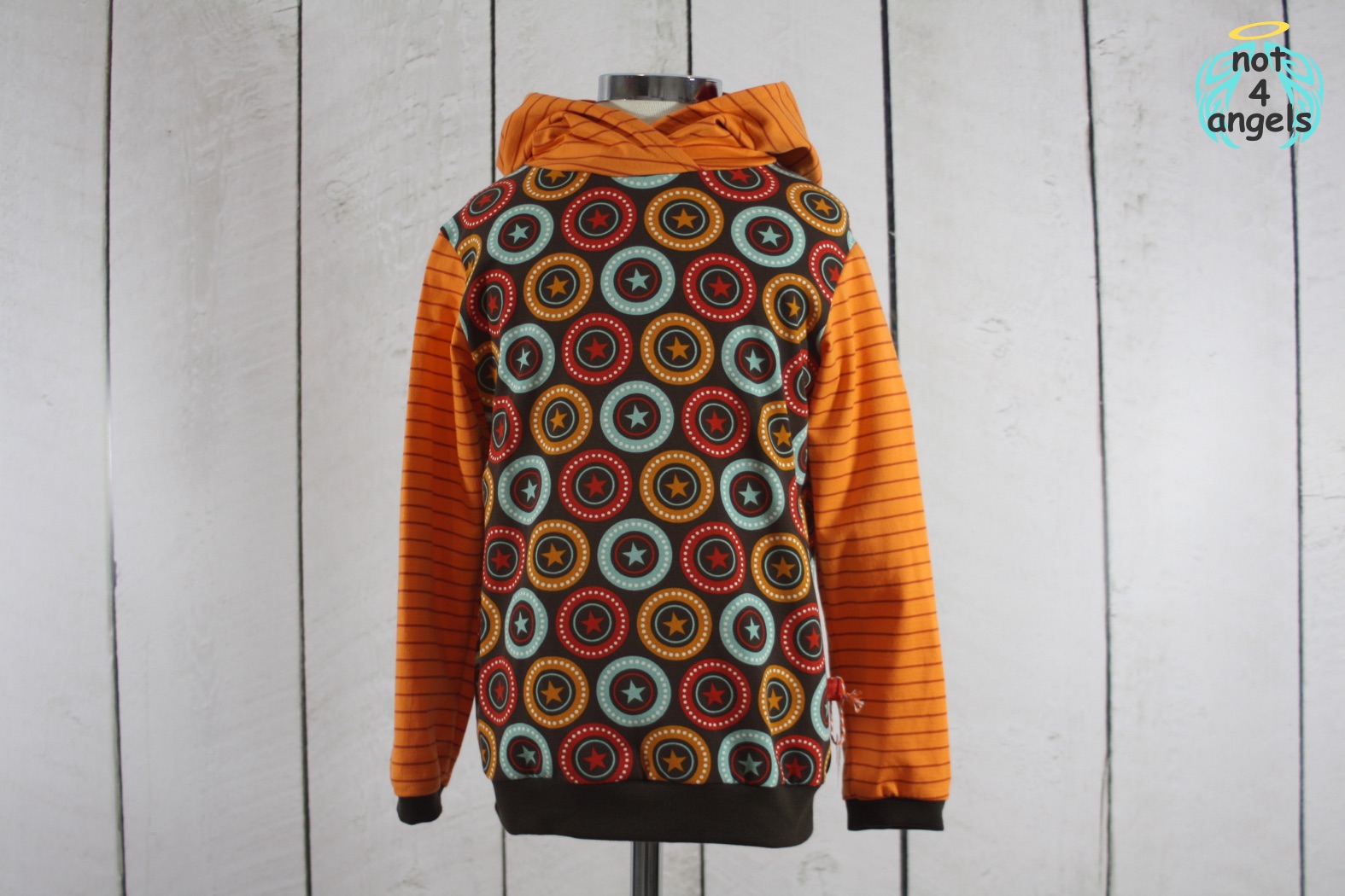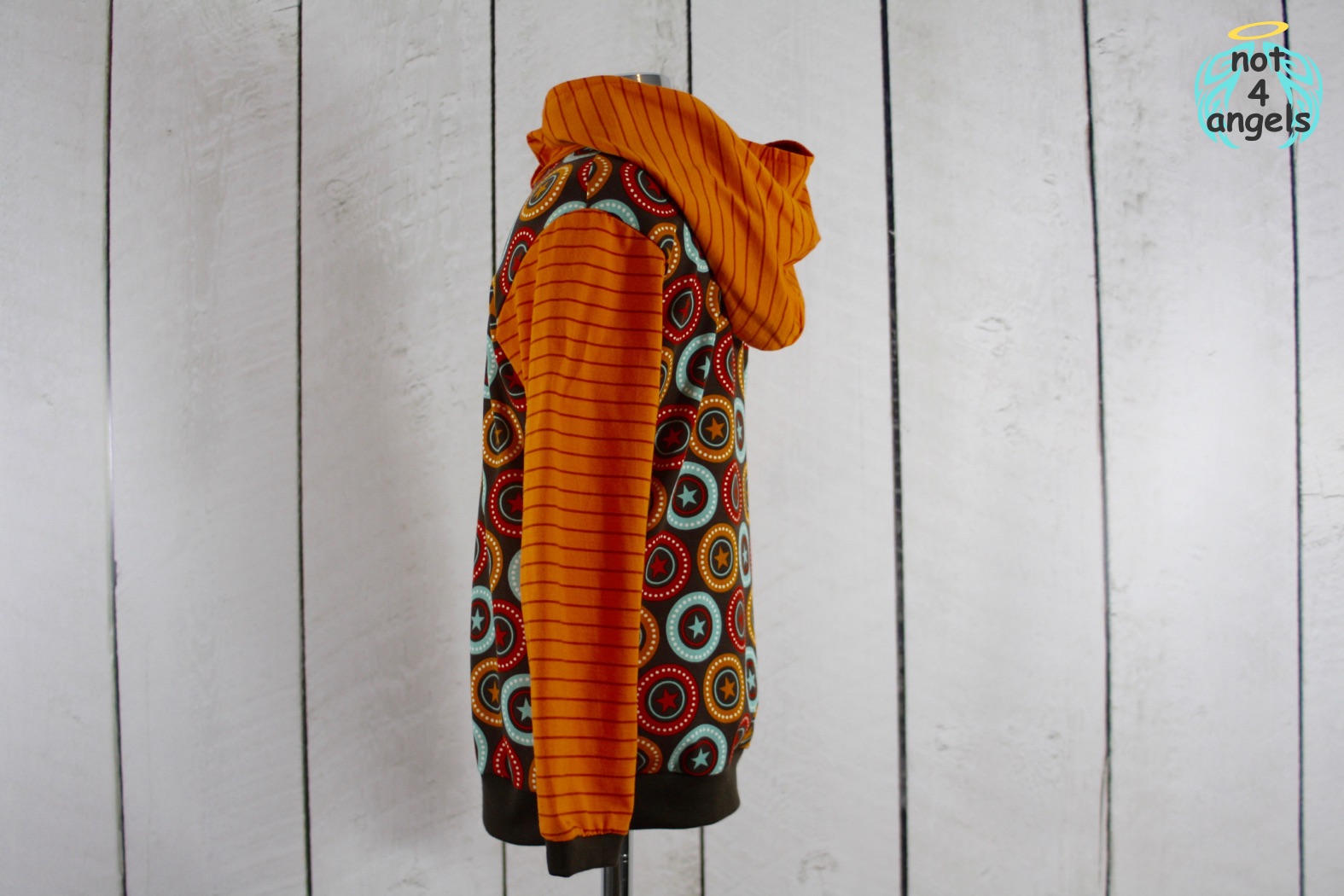 Der Hoodie besteht aus weichem Stretchjersey. Ärmel und Außenkaputze bestehen aus rot-orange gestreiftem Stretchjersey, die Innen-Kaputze aus rotem Baumwoll-Jersey.