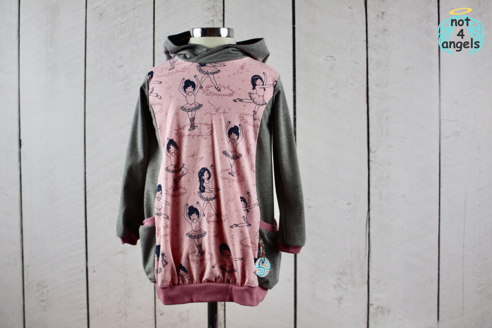 Das langärmelige Kleidchen hat keine Seitennaht, sondern breite seitliche Einsätze. Über die ganze Breite der Einsätze ist jeweils eine Tasche mitgefasst. Hier kann man herrlich Kleinkram verstecken und allerlei sammeln.