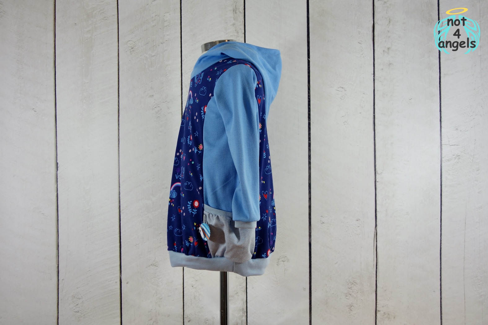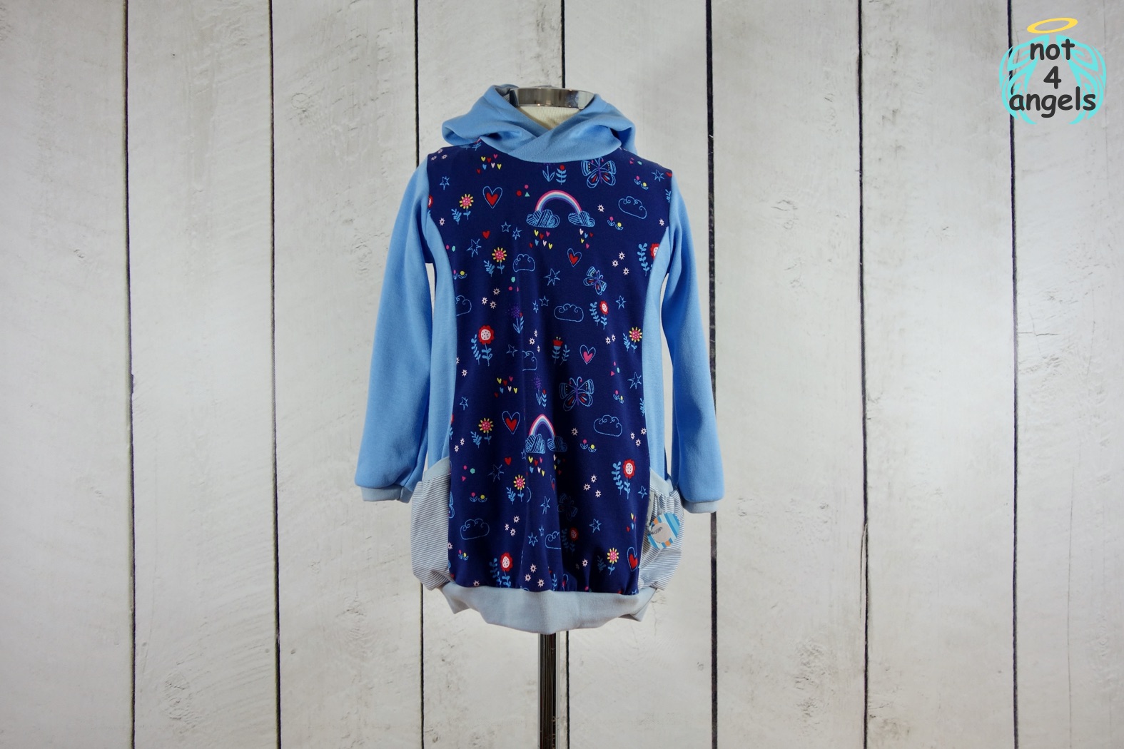 Das langärmelige Kleidchen hat keine Seitennaht, sondern breite seitliche Einsätze. Über die ganze Breite der Einsätze ist jeweils eine Tasche mitgefasst. Hier kann man herrlich Kleinkram verstecken und allerlei sammeln.