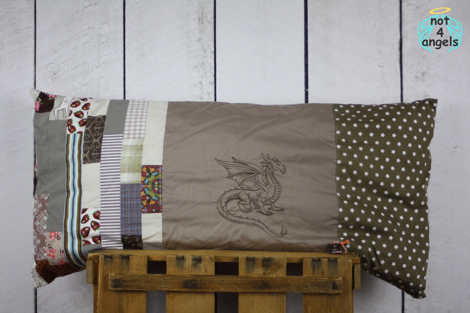Der Kissenbezug ist aus mehreren Stoffen gepatcht. Es wurden einzelne Streifen von Stoffen in braun-Tönen zu einem großen Stoffstück zusammengenäht. Daneben wurde ein Stoff mit einer coolen Stickerei versehen. Den Abschluss bildet rechts ein Stoff mit Sternen.