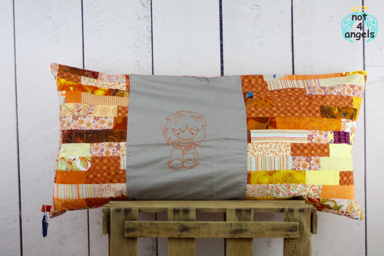 Der Kissenbezug ist aus mehreren Stoffen gepatcht. Es wurden einzelne Streifen von Stoffen in orange-Tönen zu großen Stoffstücken zusammengenäht. Als Zwischen-Einsatz wurde ein Baumwollstoff in silber mit einer süßen Stickerei versehen.