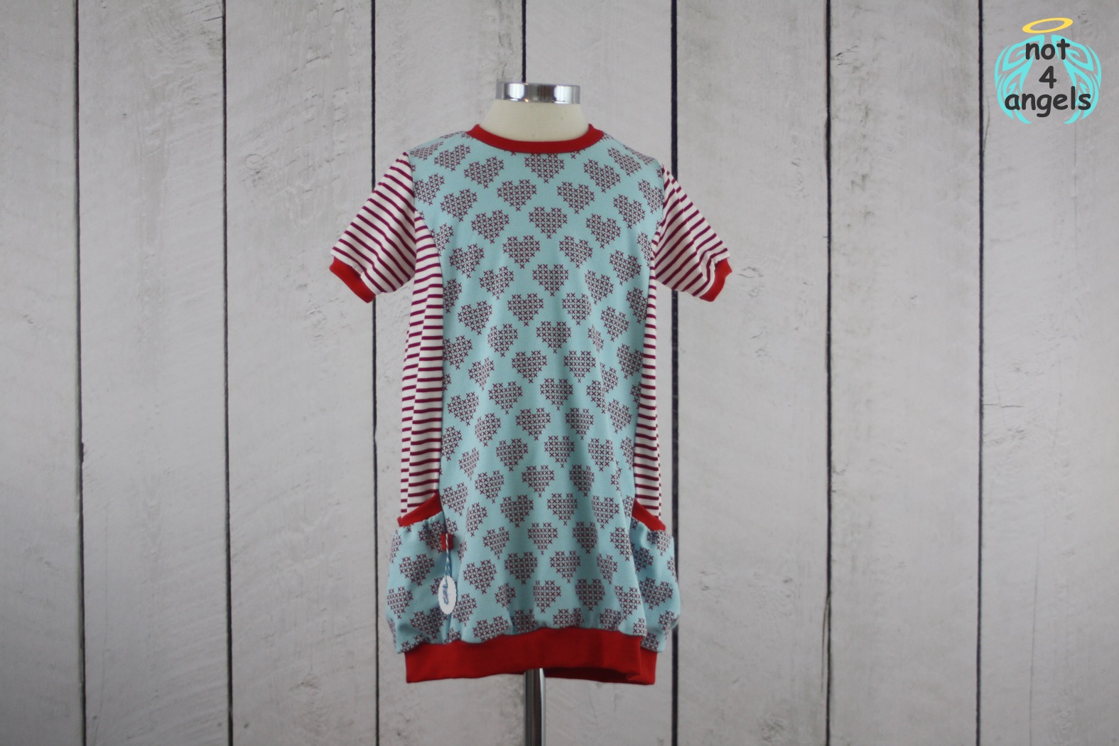 Das kurzärmelige Kleidchen hat keine Seitennaht, sondern breite seitliche Einsätze. Über die ganze Breite der Einsätze ist jeweils eine Tasche mitgefasst. Hier kann man herrlich Kleinkram verstecken und allerlei sammeln.