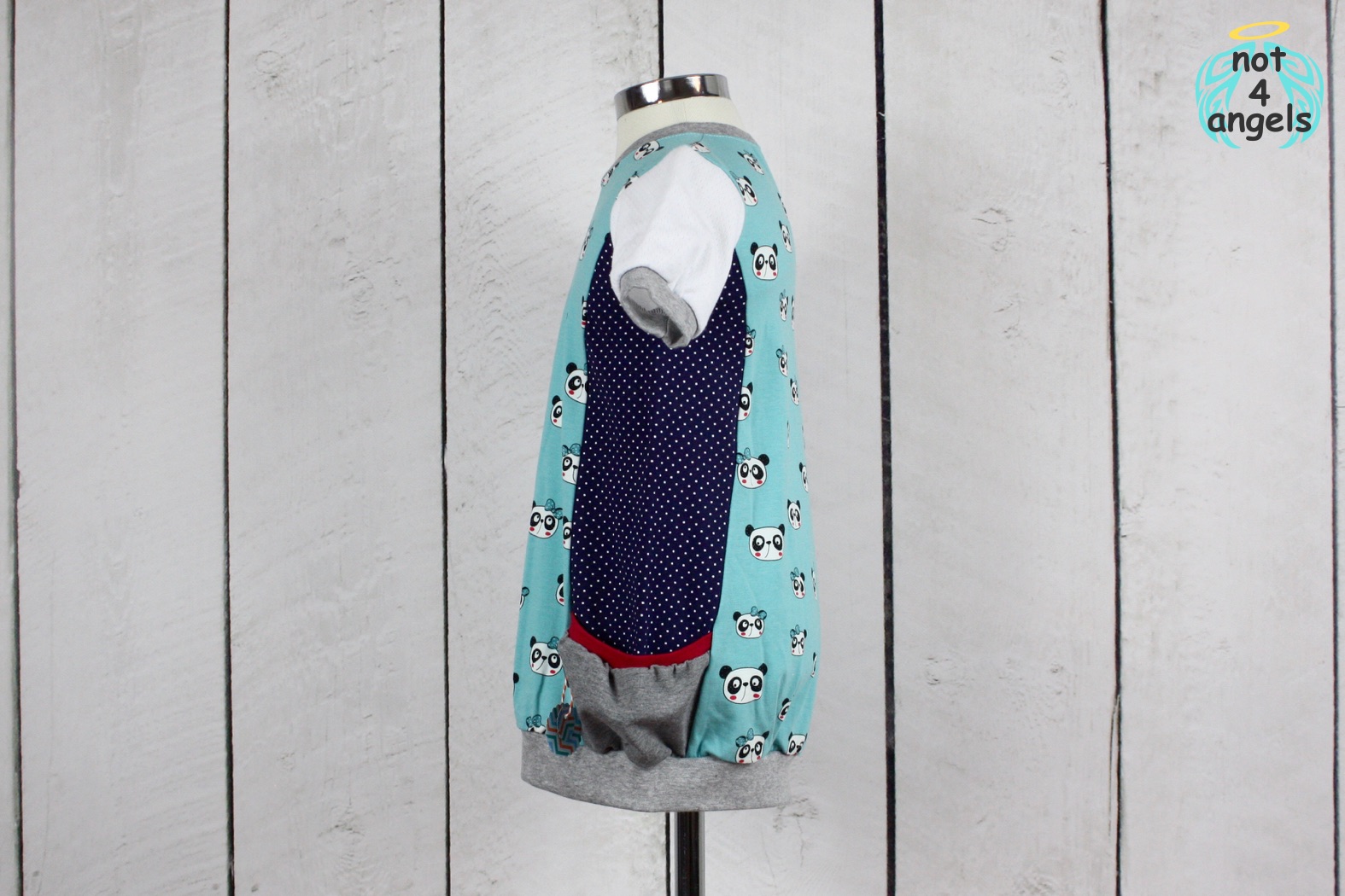 Das kurzärmelige Kleidchen hat keine Seitennaht, sondern breite seitliche Einsätze. Über die ganze Breite der Einsätze ist jeweils eine Tasche mitgefasst. Hier kann man herrlich Kleinkram verstecken und allerlei sammeln.