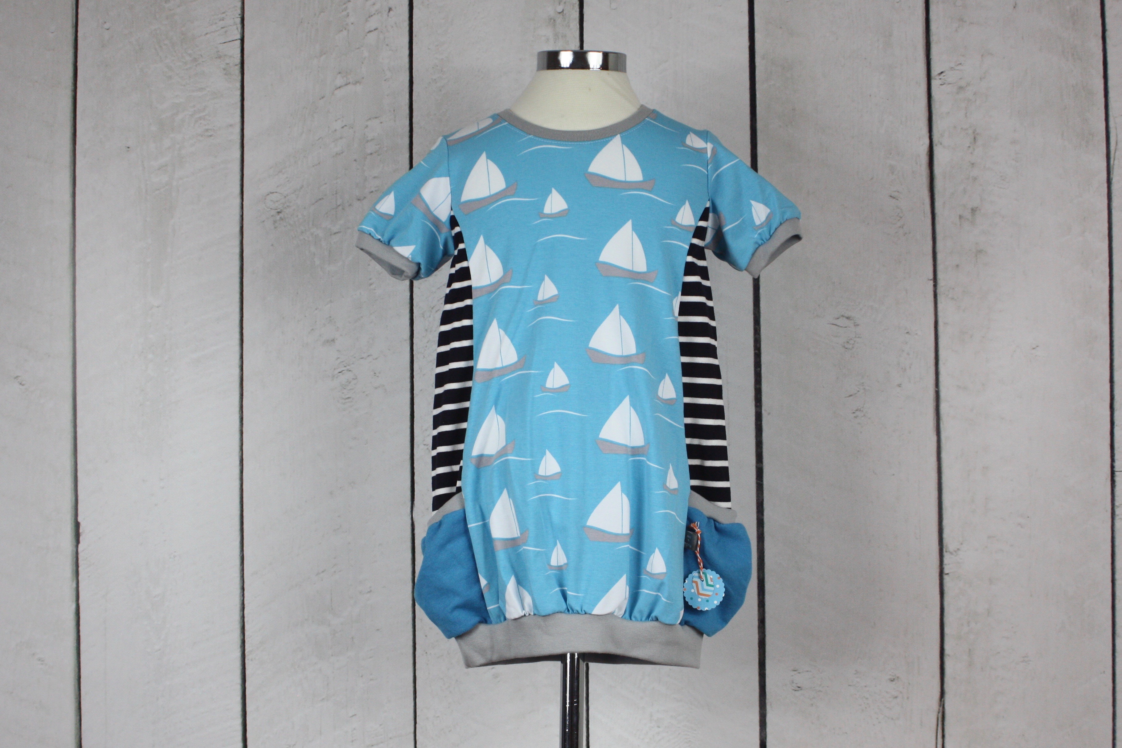 Das kurzärmelige Kleidchen hat keine Seitennaht, sondern breite seitliche Einsätze. Über die ganze Breite der Einsätze ist jeweils eine Tasche mitgefasst. Hier kann man herrlich Kleinkram verstecken und allerlei sammeln.