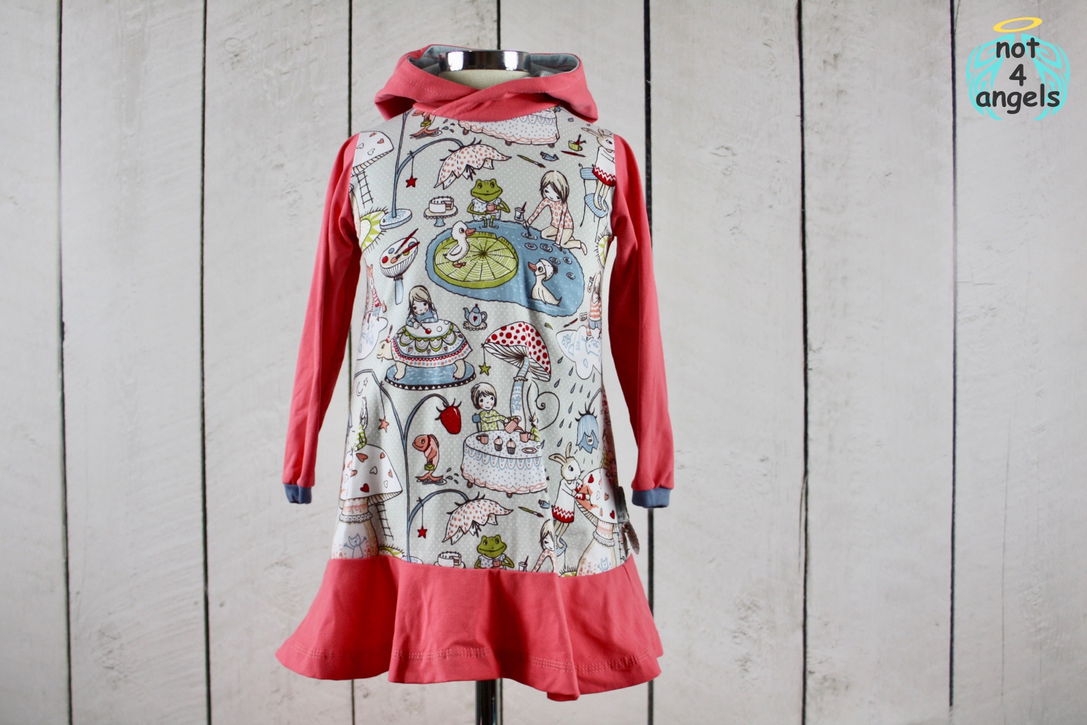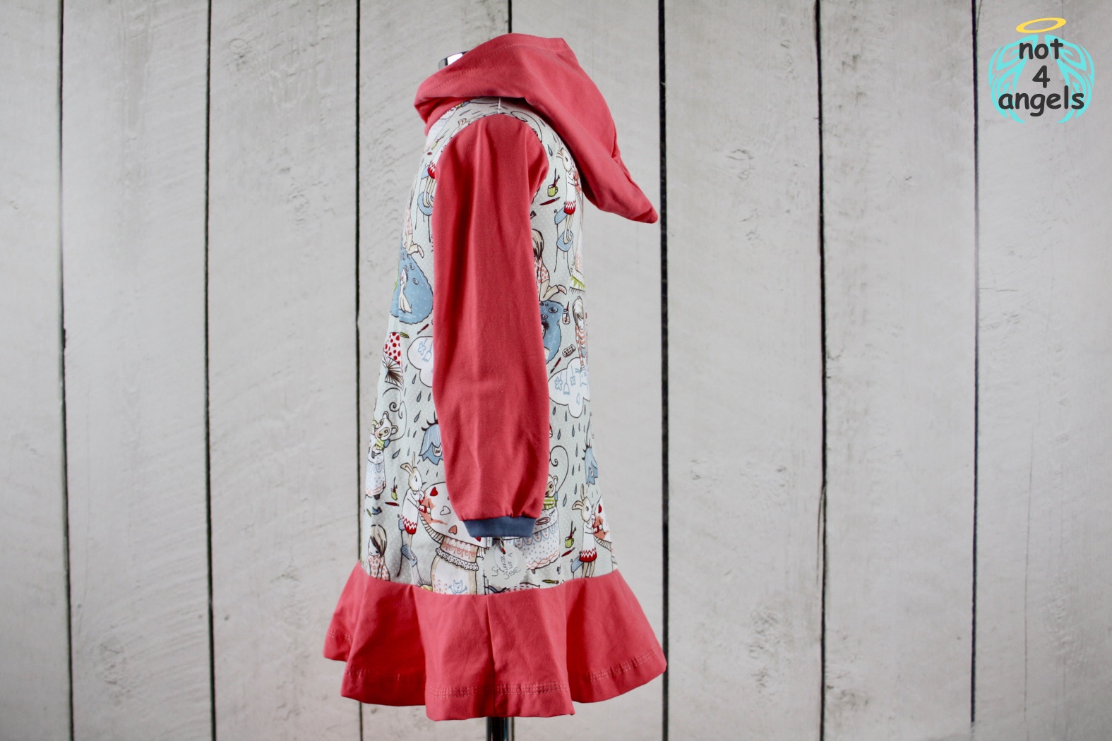 Das Kleid hat lange Ärmel und ist somit auch für die kühleren Tage geeignet. Die Kaputze ist farblich passend gefüttert. Der Volant am unteren Abschluss gibt dem Kleidchen einen ganz süßen Schwung.