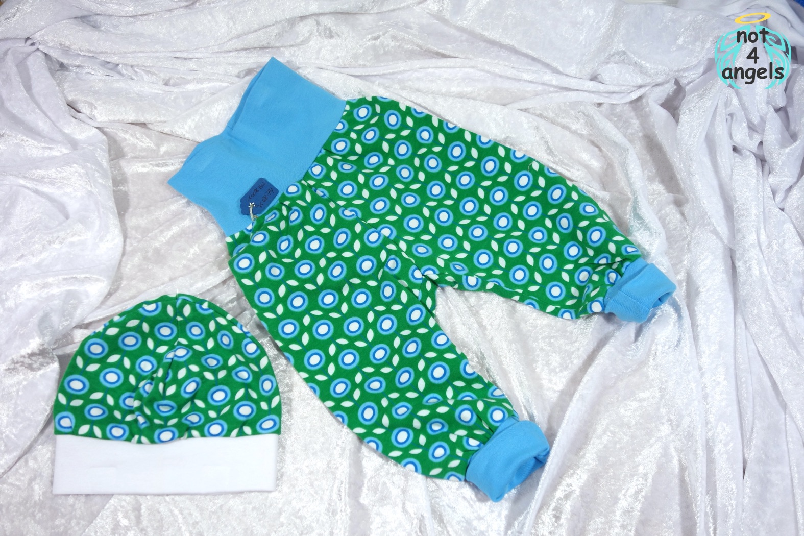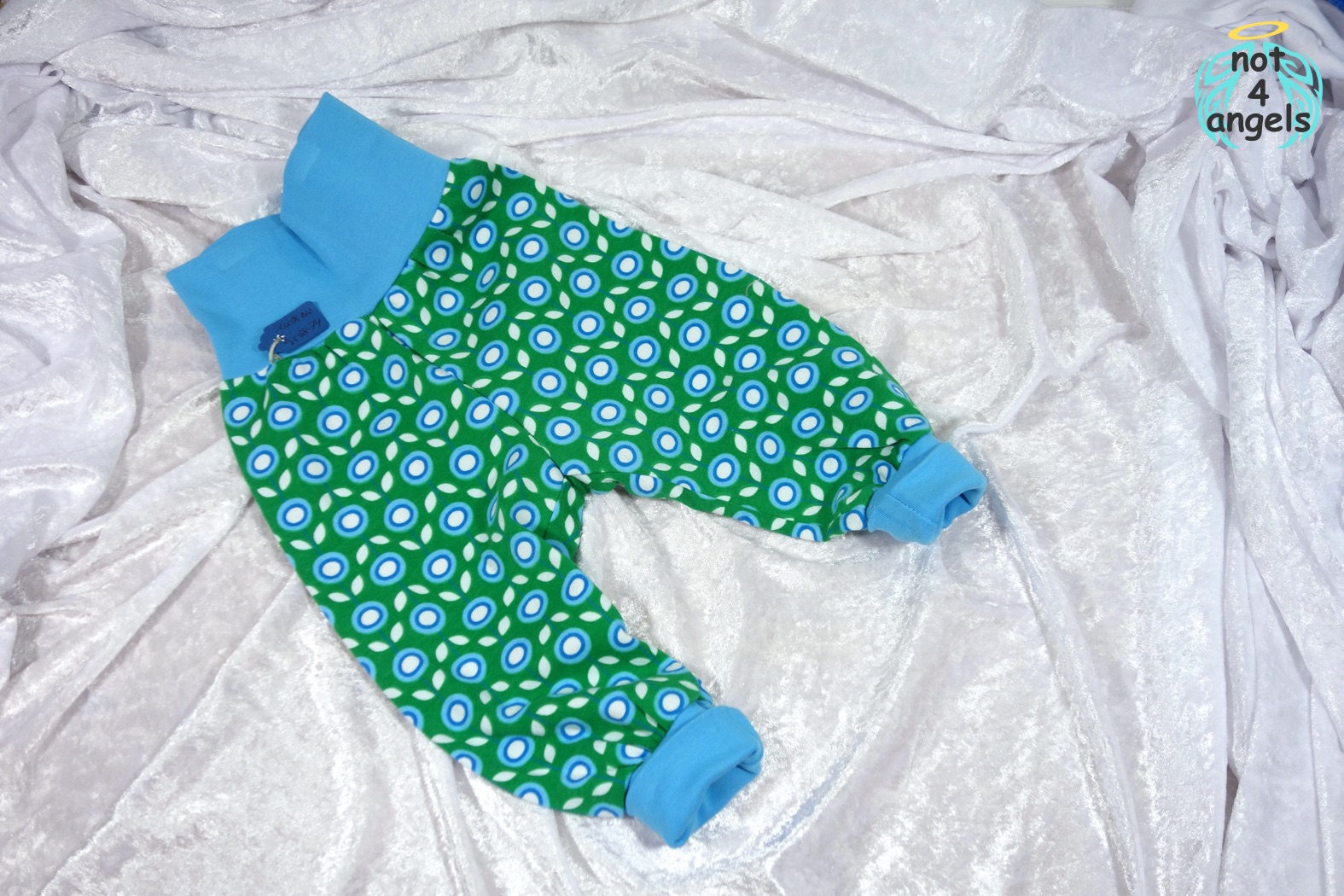 - Schließlich beginnen die Beinchen des Babys, aus den Hosenbeinen herauszuwachsen. Die Hosen werden so lange getragen, bis die Bündchen in den Kniekehlen sitzen. Dann werden sie als kurze Hosen getragen. Da der Schnitt sehr weit ist, macht die Hose das Wachstum gut mit.