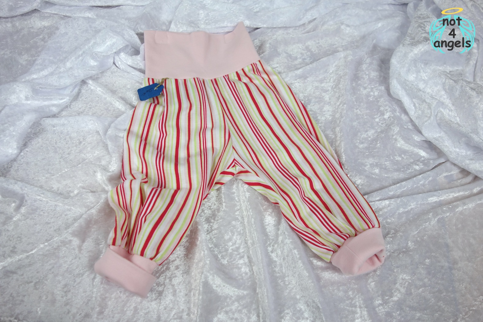 - Schließlich beginnen die Beinchen des Babys, aus den Hosenbeinen herauszuwachsen. Die Hosen werden so lange getragen, bis die Bündchen in den Kniekehlen sitzen. Dann werden sie als kurze Hosen getragen. Da der Schnitt sehr weit ist, macht die Hose das Wachstum gut mit.