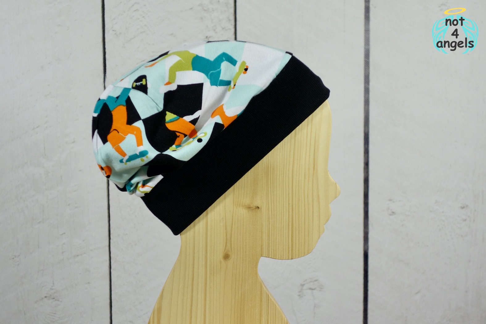 Die Mütze passt bei einem Kopfumfang von ca. 47-53cm. Das Bündchen liegt an den Ohren an, der Haubenteil ist weiter und wirkt durch seine Überlänge pfiffig.
