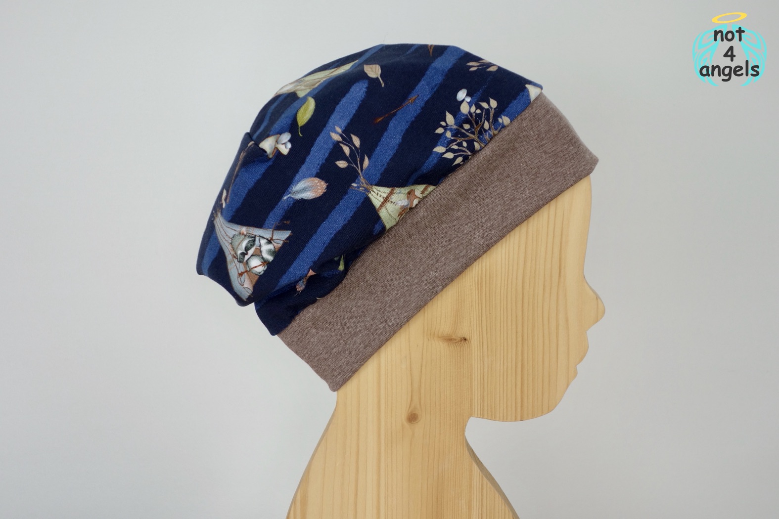 Die Mütze passt bei einem Kopfumfang von ca. 47-53cm. Das Bündchen liegt an den Ohren an, der Haubenteil ist weiter und wirkt durch seine Überlänge pfiffig.