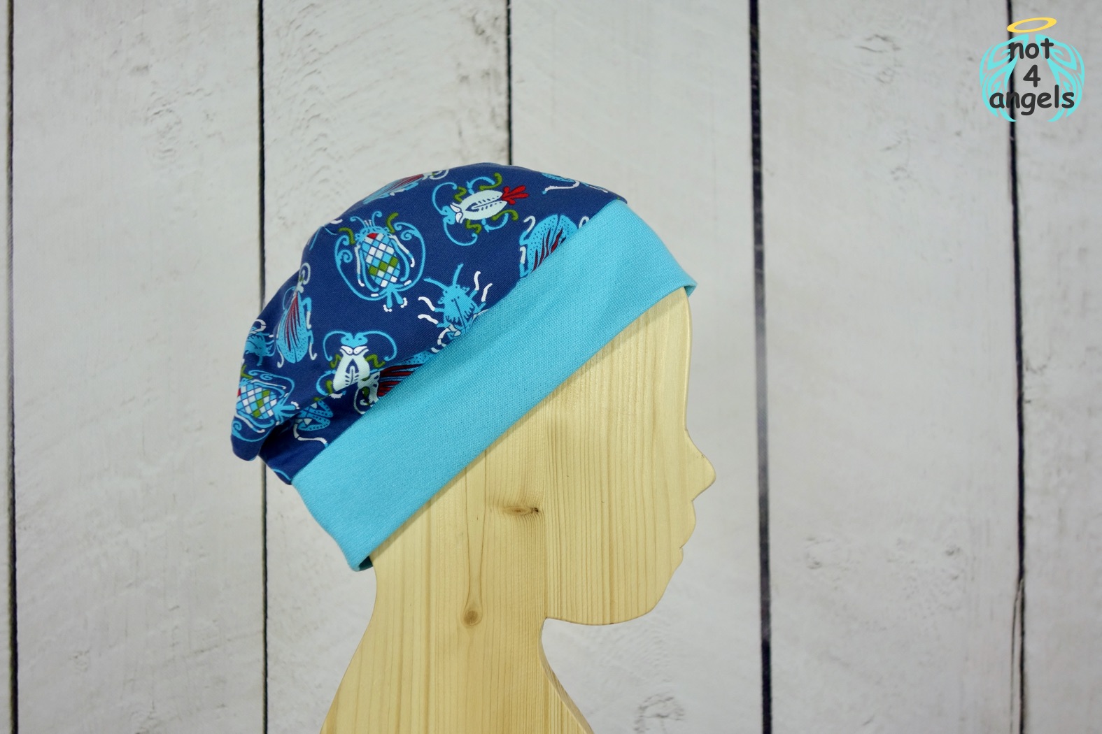 Die Mütze passt bei einem Kopfumfang von ca. 47-53cm. Das Bündchen liegt an den Ohren an, der Haubenteil ist weiter und wirkt durch seine Überlänge pfiffig.
