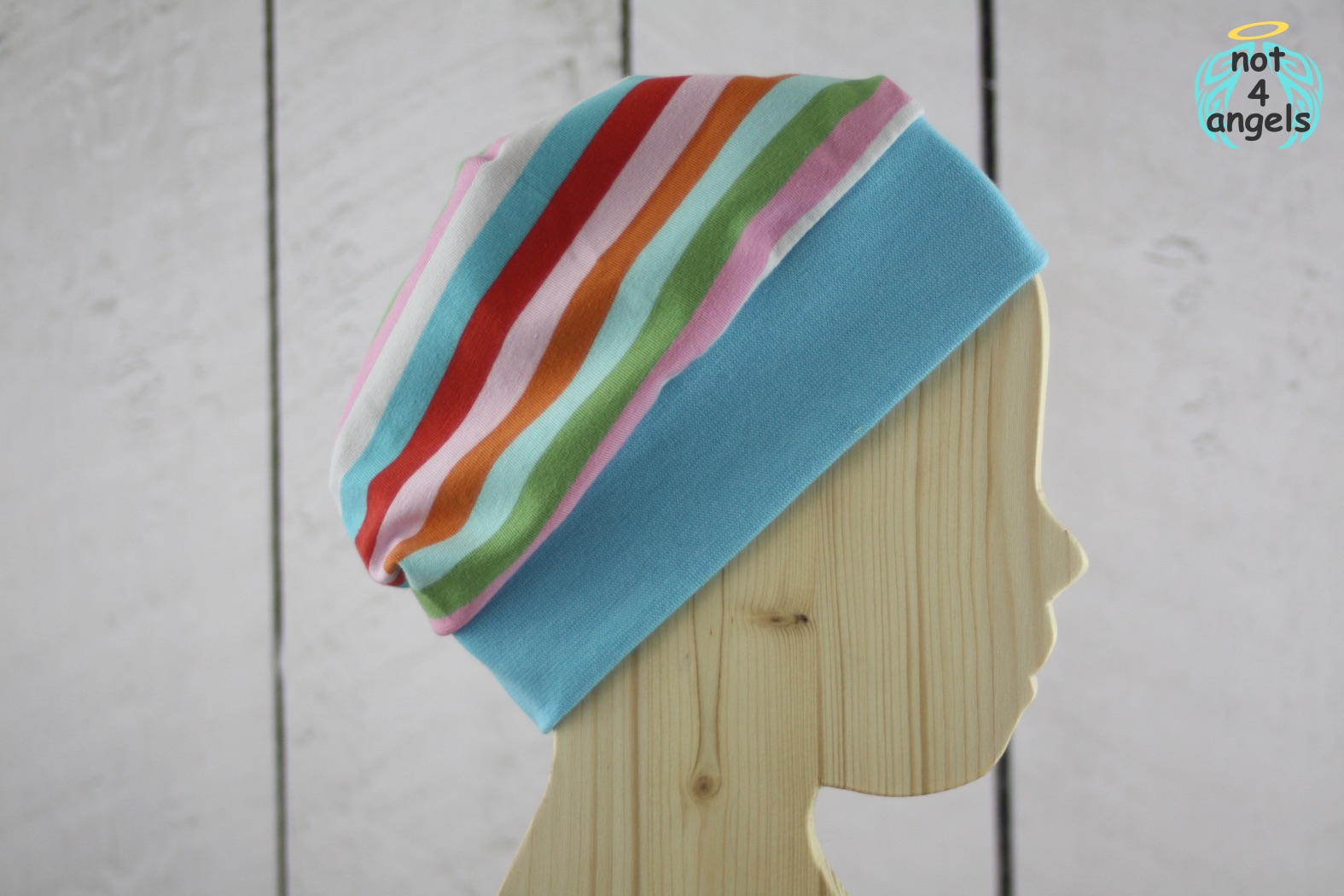 Die Mütze passt bei einem Kopfumfang von ca. 47-53cm. Das Bündchen liegt an den Ohren an, der Haubenteil ist weiter und wirkt durch seine Überlänge pfiffig.