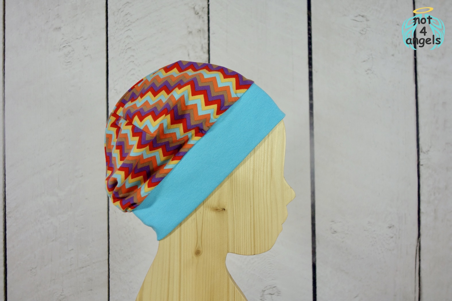 Die Mütze passt bei einem Kopfumfang von ca. 47-53cm. Das Bündchen liegt an den Ohren an, der Haubenteil ist weiter und wirkt durch seine Überlänge pfiffig.