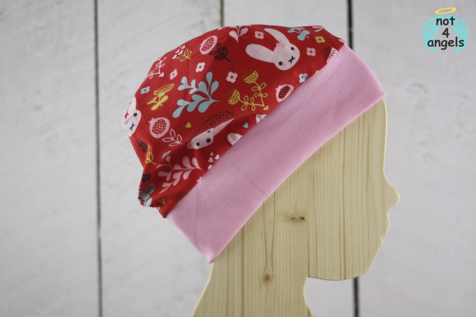Die Mütze passt bei einem Kopfumfang von ca. 47-53cm. Das Bündchen liegt an den Ohren an, der Haubenteil ist weiter und wirkt durch seine Überlänge pfiffig.