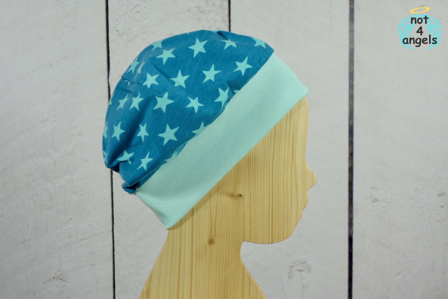 Die Mütze passt bei einem Kopfumfang von ca. 47-53cm. Das Bündchen liegt an den Ohren an, der Haubenteil ist weiter und wirkt durch seine Überlänge pfiffig.