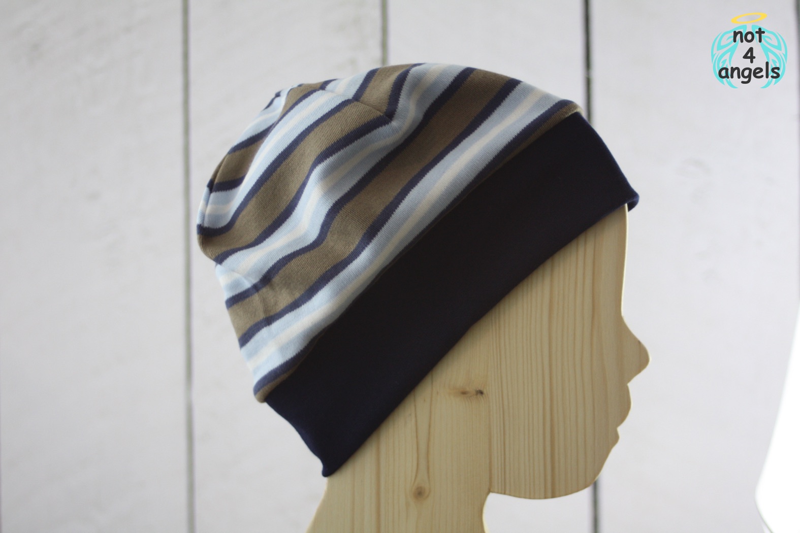 Die Mütze passt bei einem Kopfumfang von ca. 47-53cm. Das Bündchen liegt an den Ohren an, der Haubenteil ist weiter und wirkt durch seine Überlänge pfiffig.