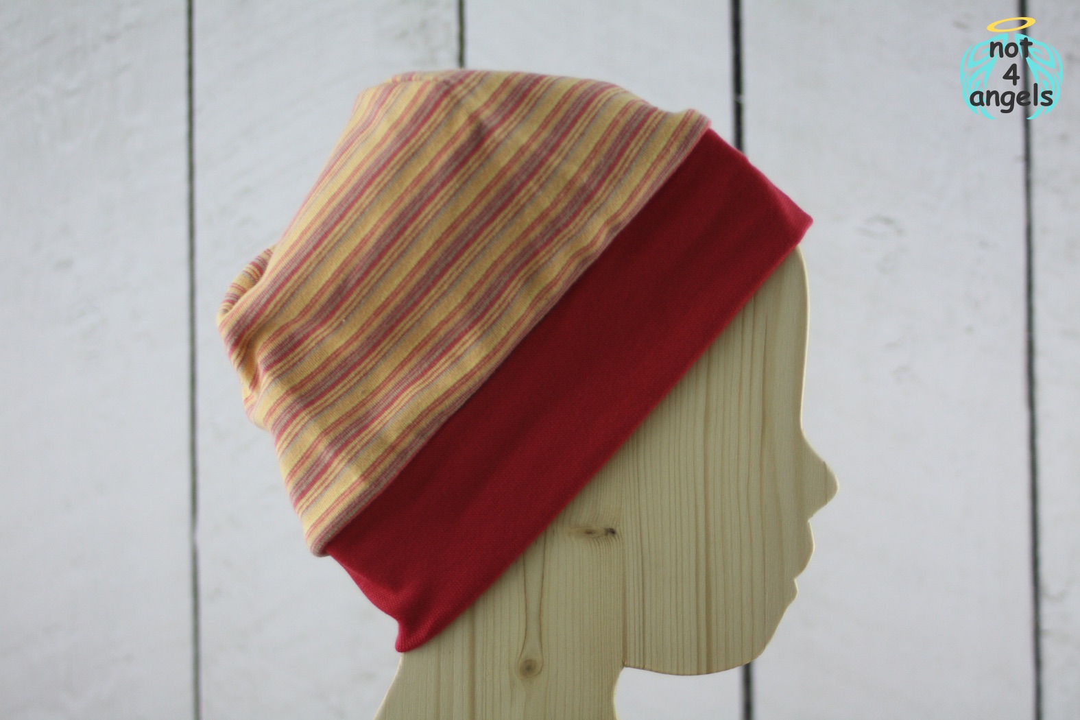 Die Mütze passt bei einem Kopfumfang von ca. 47-53cm. Das Bündchen liegt an den Ohren an, der Haubenteil ist weiter und wirkt durch seine Überlänge pfiffig.