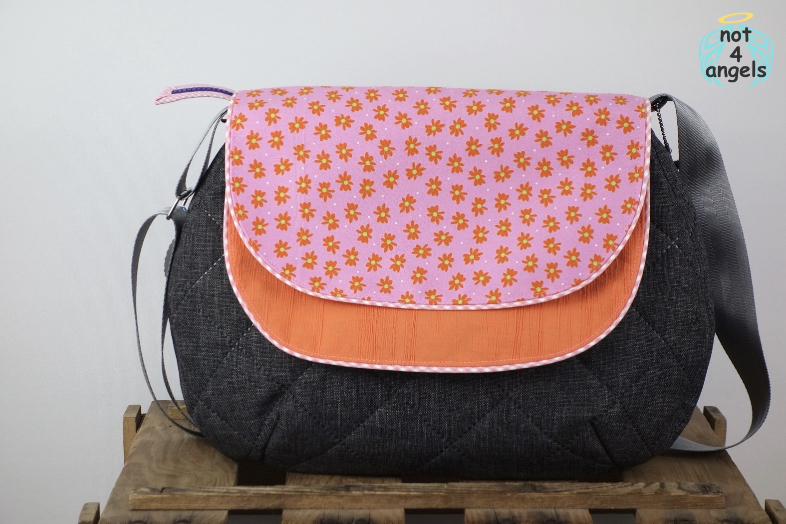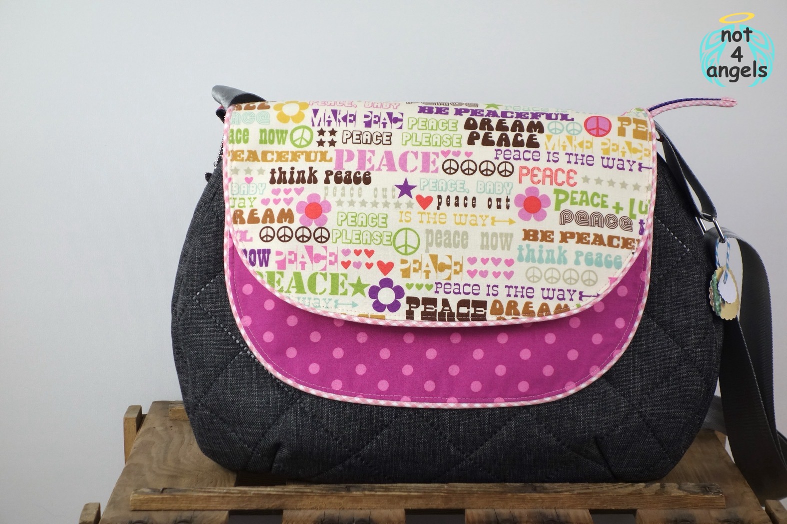 Diese Tasche ist eine echte Stimmungstasche. Durch die beiden unterschiedlichen Klappen-Seiten wirkt es, als habe man zwei Taschen, dabei ist es immer dieselbe. Sie wird mit einem Reißverschluss geschlossen, so dass es Langfingern schwerfällt, an den Inhalt zu kommen.