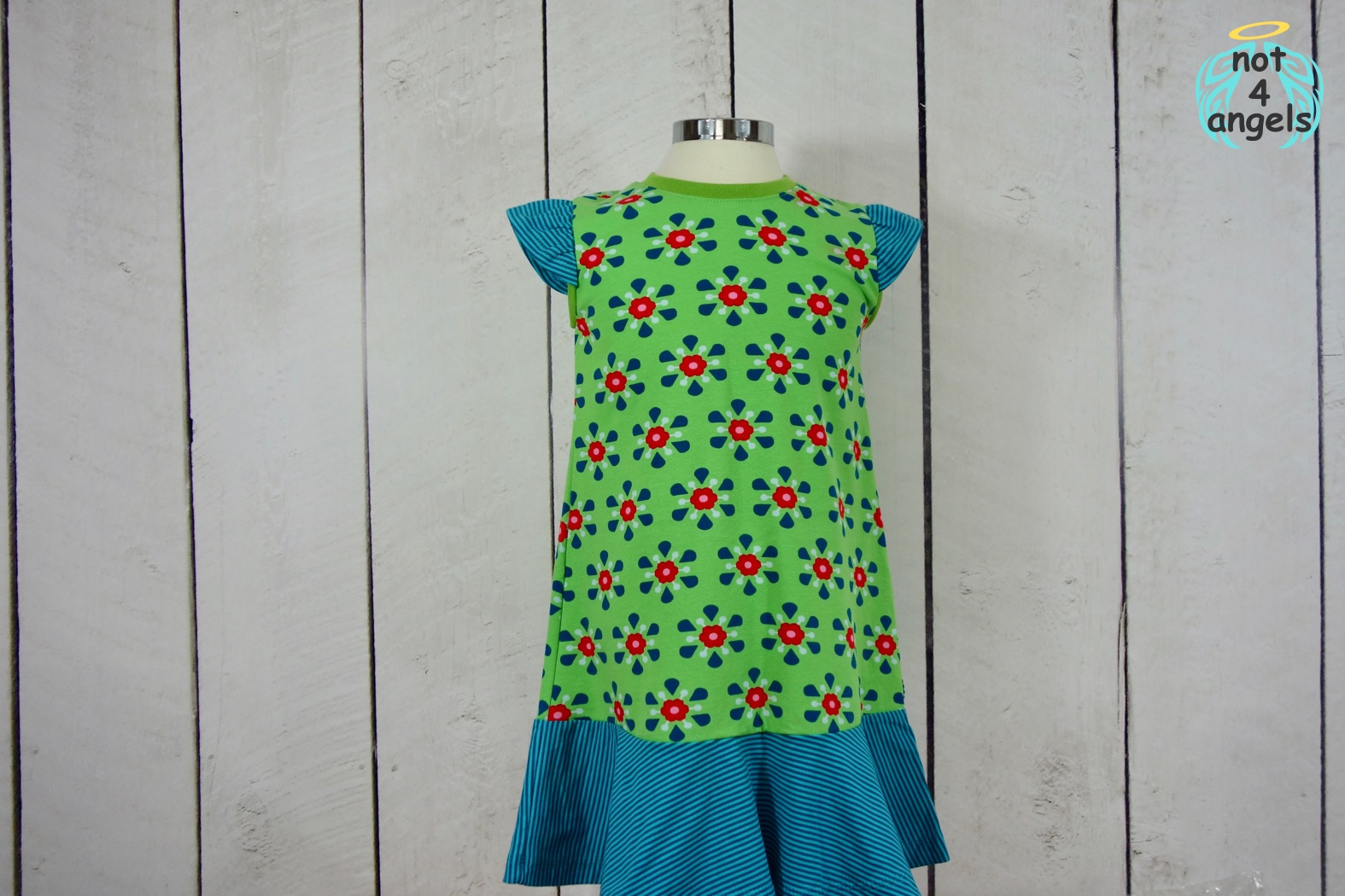 Das Kleid hat kleine Flügelärmchen und ist an den Ausschnitten mit Bündchen eingefasst. So sitzt es herrlich bequem und ist ein ganz toller Begleiter durch die heißen Tage. Der Volant am unteren Abschluss gibt dem Kleidchen einen ganz süßen Schwung.