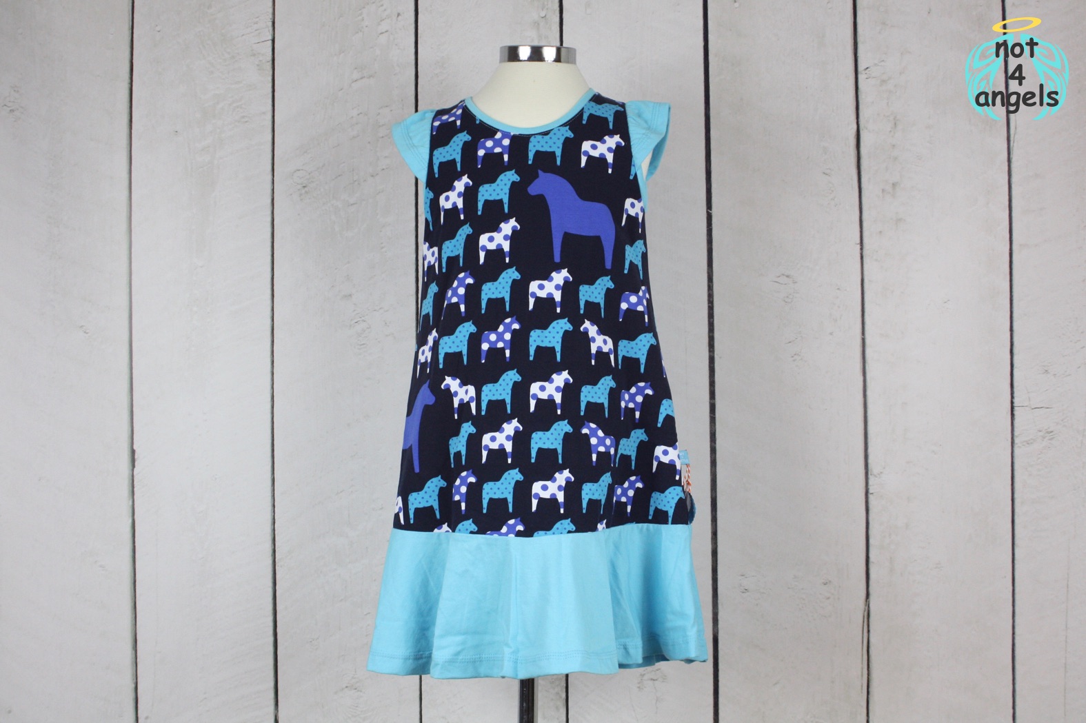 Das Kleid hat kleine Flügelärmchen und ist an den Ausschnitten mit Bündchen eingefasst. So sitzt es herrlich bequem und ist ein ganz toller Begleiter durch die heißen Tage. Der Volant am unteren Abschluss gibt dem Kleidchen einen ganz süßen Schwung.