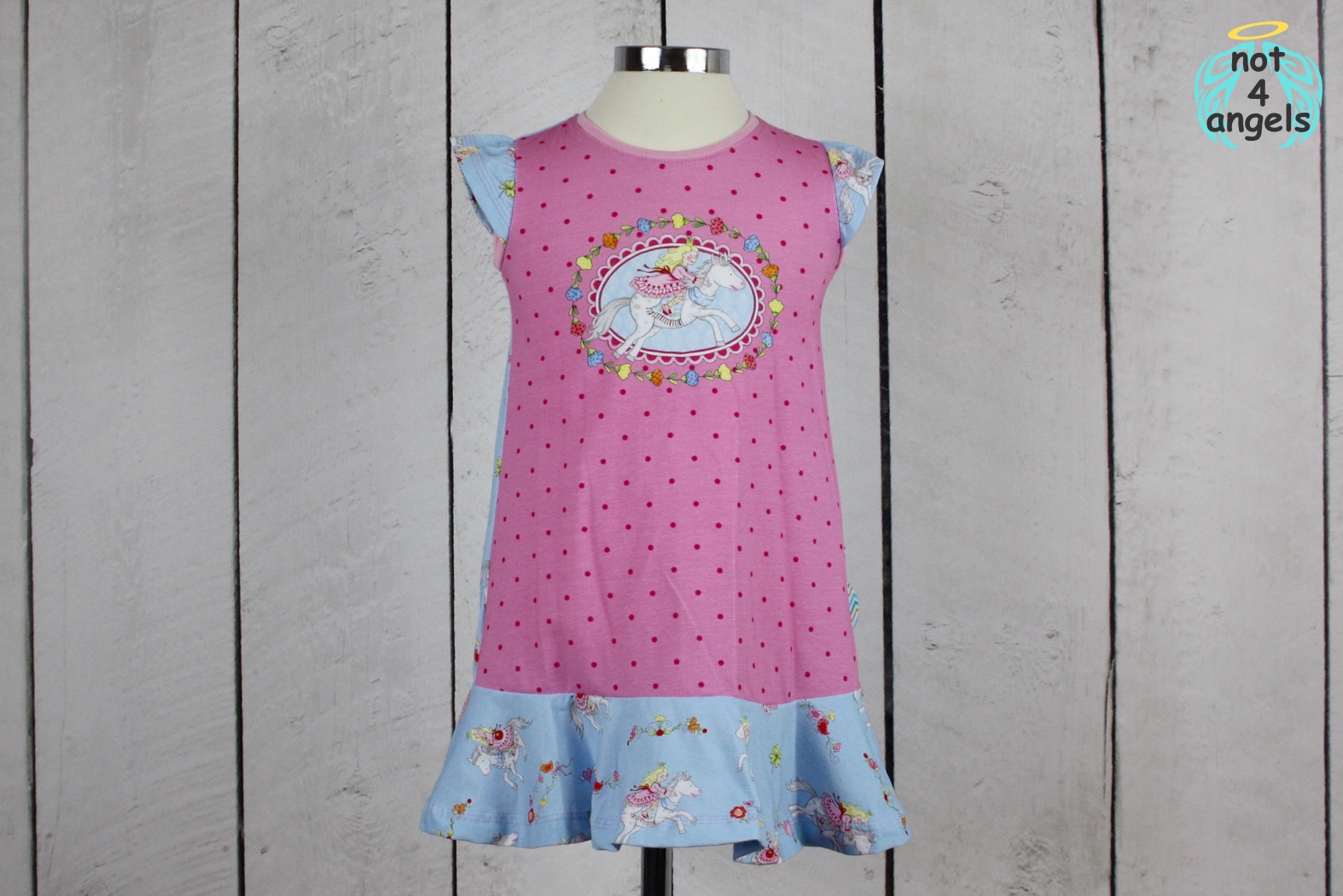 Das Kleid hat kleine Flügelärmchen und ist an den Ausschnitten mit Bündchen eingefasst. So sitzt es herrlich bequem und ist ein ganz toller Begleiter durch die heißen Tage. Der Volant am unteren Abschluss gibt dem Kleidchen einen ganz süßen Schwung.